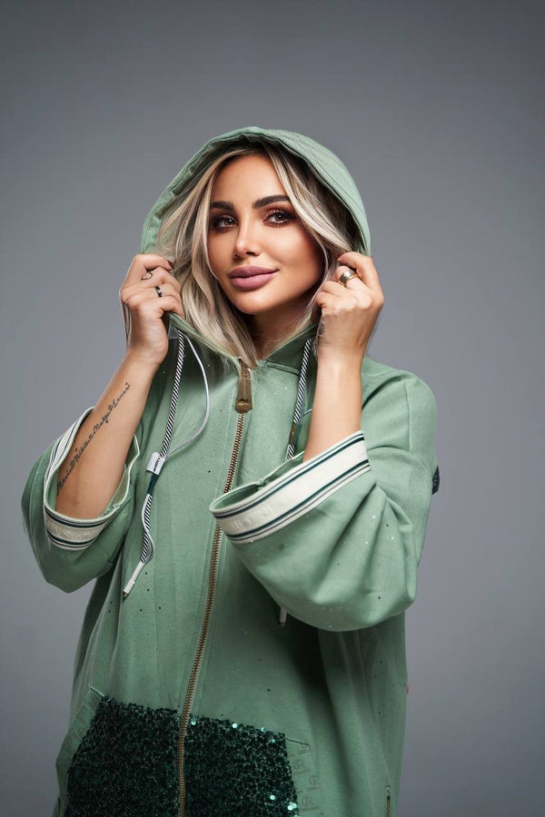 Komfort trifft auf Glamour: Das Crisanta Hoodie Set in Sparkle Green bringt Lässigkeit und Eleganz zusammen.